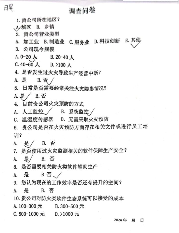 除此之外,我們還詢問了工廠負責人對我們的防火軟件有沒有合作意愿,并給工廠負責人看了我們軟件的大體操作流程,他提出了很多意見。例如,如果真的開發出這款軟件并且要出售的話可以找消防機構;在價格方面他表示在1000元左右才會有人使用,價格再高基本上沒人會使用了;并希望軟件可以連接在手機上,如果有火情的話老板可以第一事件看到。