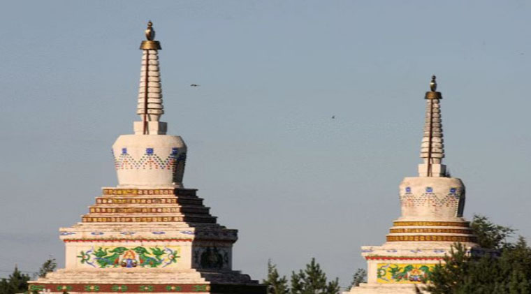 走出肇源博物館,隨后,實(shí)踐團(tuán)成員共同參觀衍福寺。在衍福寺中,衍福寺雙塔和影壁最為著名,是省級(jí)重點(diǎn)文物保護(hù)單位,衍福寺坐落于黑龍江省大慶市肇源縣民意鄉(xiāng)大廟村境內(nèi),始建于清初,擴(kuò)建與康熙二十三年,是藏傳佛教圣地。衍福寺的影壁長(zhǎng)達(dá)十六米,值得注意的是影壁的中部建造為一個(gè)池子,根據(jù)寺廟工作人員介紹,該池子四角的雕刻為彩繪蔓草花紋,南面是“海馬朝云”,北面是“二龍戲珠”,靈巧勾勒精美的線條,構(gòu)成了精妙絕倫的圖案,在該池中的圖案紋飾均為典型的肇源彩繪文化的紋飾與圖案。位于白金包屯白金寶文化遺址的衍福寺為藏傳佛教的寺廟,寺廟整體亦是中華宗教建筑文化的小小縮影,但因此處多用蔓草、二龍戲珠等肇源彩繪的標(biāo)志性紋飾,也是肇源彩繪文化發(fā)展的重要見(jiàn)證。