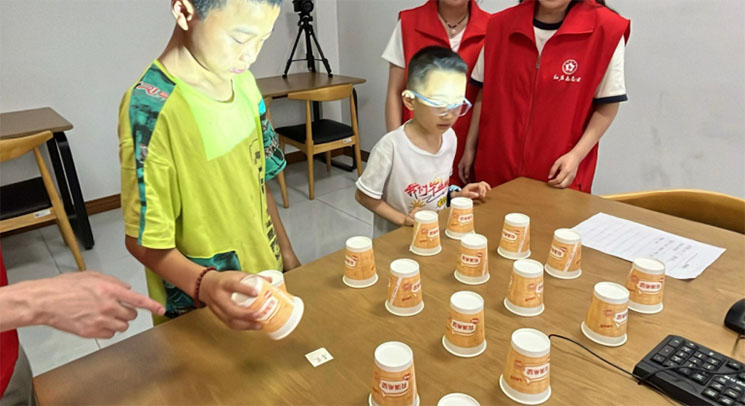 第二個游戲“沉默的密碼”。小朋友們站成一排,隨機抽取撲克牌,隨機給出排列順序,小朋友們不能說話,只能通過拍打別人的次數(shù)來傳遞自己是幾號數(shù)字這一環(huán)節(jié)考驗了小朋友們的非言語溝通能力和觀察能力。