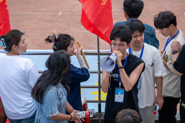 圖為醫(yī)藥信息工程學院組織志愿者看臺就坐。