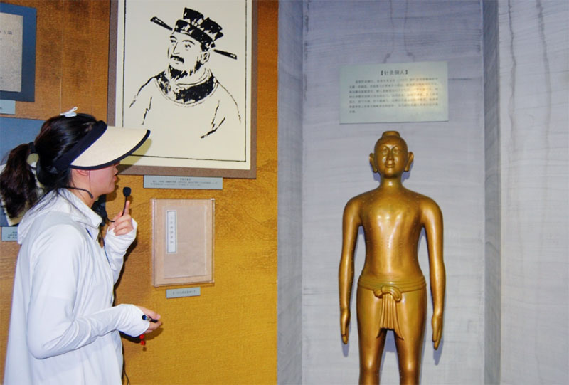 圖為講解員在講述館內(nèi)銅人作用 彭盛琦 攝