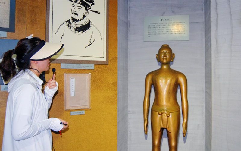 圖為導游為中華文化傳承實踐團成員講解針灸銅人。