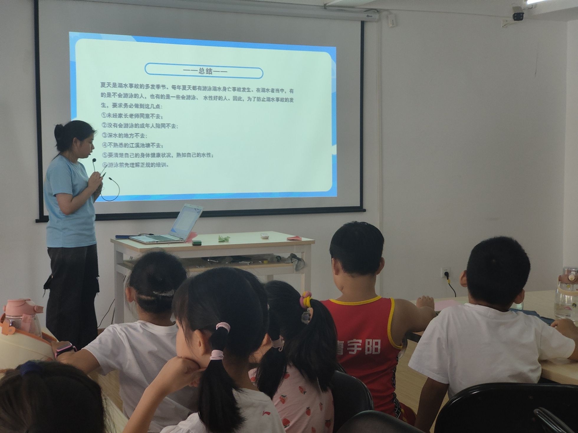 圖為實踐隊員在應急救護課,為小朋友們進行“防溺水”教育,并總結“防溺水”要點及注意事項。