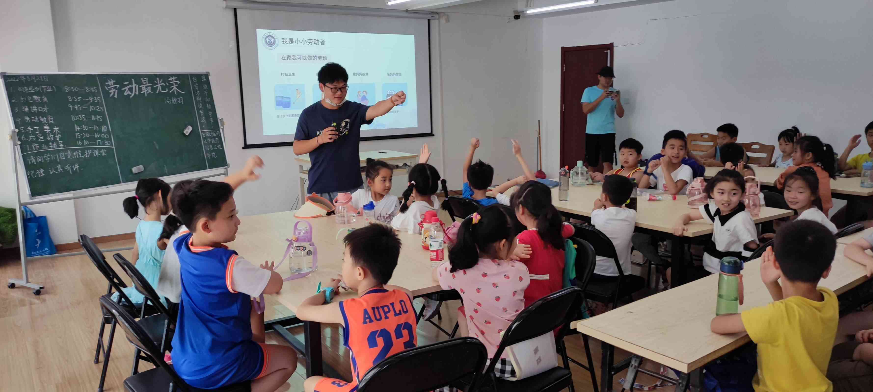 圖為勞動教育課,一位非常害羞的小朋友在實踐隊員和其他小朋友的鼓勵下,主動舉手回答問題。