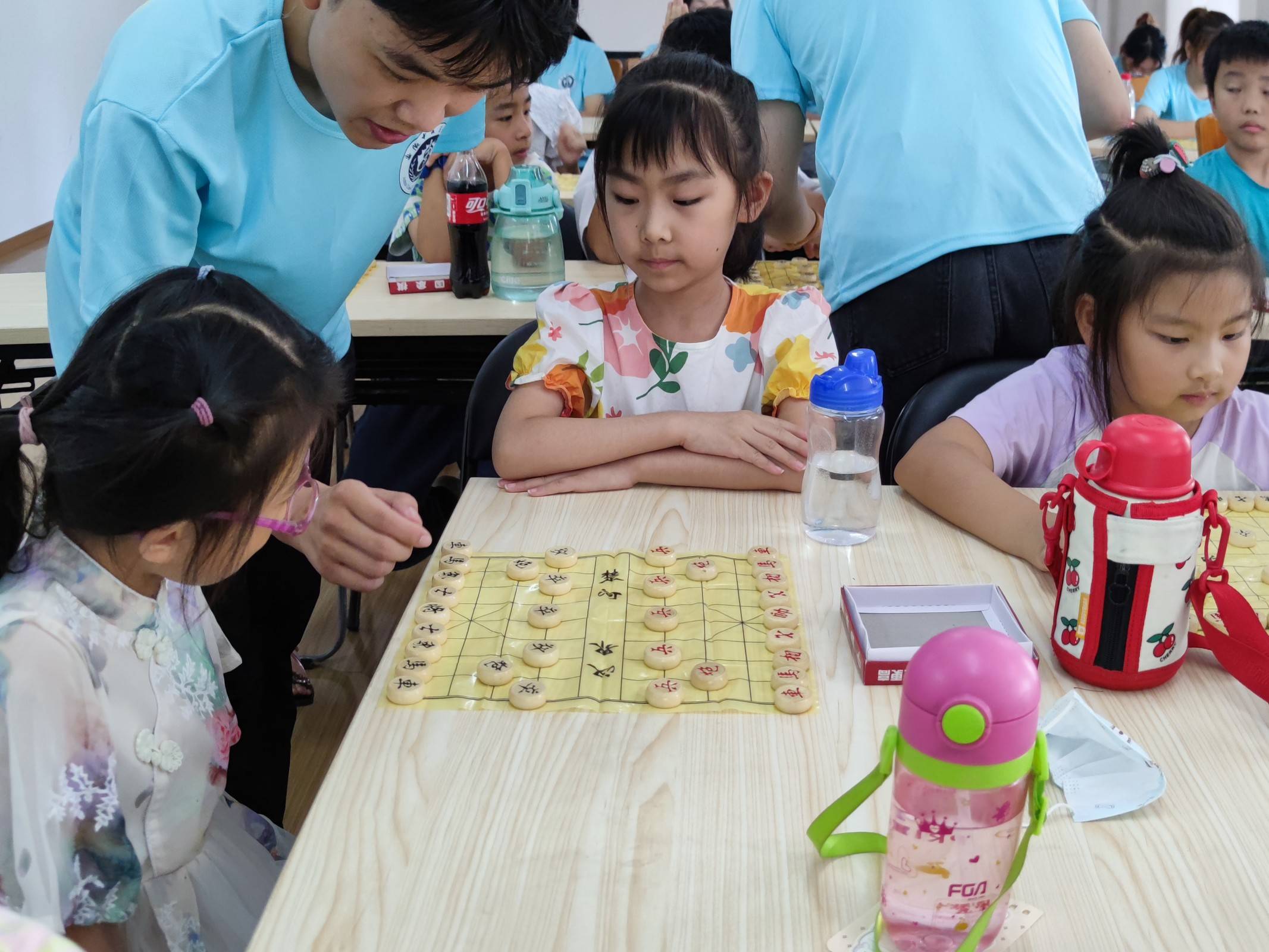 圖為中國象棋課,小朋友對“象棋”這一中國國粹產(chǎn)生了極強(qiáng)的興趣,他在實踐隊員的帶領(lǐng)下,主動上臺學(xué)習(xí)象棋的擺法,并渴望更深入地學(xué)習(xí)象棋知識。