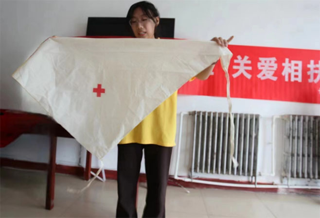 隨后,志愿者們又針對創傷出血的常見情況,演示了多種包扎方法,如繃帶的環形包扎、螺旋包扎法,以及三角巾的頭頂帽式包扎和單側胸部包扎等。