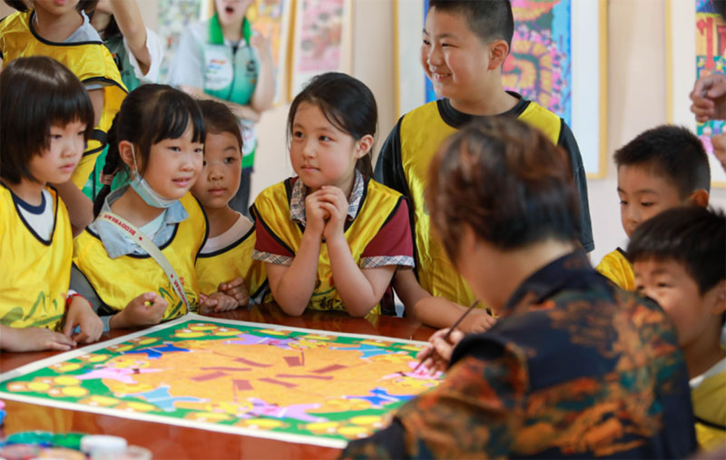 圖為實踐隊在帶領暑托班兒童參觀非遺農民畫展館。通訊員 劉欣雨 攝。