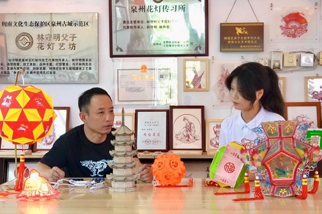 圖為實踐隊員對花燈傳承人林偉忠先生進行專訪 王嶸璇 攝