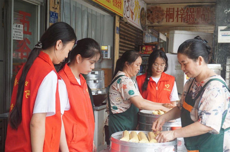 尋找彭水美食,開啟一場(chǎng)味蕾與文化的對(duì)話通過前期調(diào)研,“黎韻傳聲筒”民族團(tuán)結(jié)實(shí)踐團(tuán)隊(duì)?wèi)汛е鴮?duì)傳統(tǒng)美食的敬畏之心,制定相關(guān)路線圖,引領(lǐng)成員尋找藏匿于市井深處的美食秘境進(jìn)發(fā)。團(tuán)隊(duì)成員們帶著飽滿的熱情,化身美食偵探,穿梭于彭水的古街深巷與鄉(xiāng)間小道,漫步于熙熙攘攘的市場(chǎng),奔赴于彭水特色美食店,探索彭水美食中的苗族文化。此外,成員還深入店中,與手藝人共同制作,領(lǐng)略當(dāng)?shù)靥厣朗车奈幕攘Α?