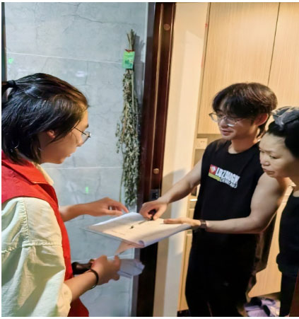 我們隨著村委書記的指引,踏過潮濕陰暗的公路,一座嶄新的花園佇立眼前——五桂村的香桂園小區盡在眼底。不是低矮的茅房,也不是隨意的草舍。嶄新的圍墻與小區周圍的住宅形成鮮明對比。在我們驚嘆活動地點之余,還注意到,小區的門匾赫然寫著“私家花園,請勿打擾”。我們挨家挨戶的進行信息采集,我們先耐心地敲了幾聲門,然后表明我們的來意,住戶也十分愿意配合我們的志愿活動,他們的熱情洋溢使我們印象深刻。房屋的各式裝修風格,也讓我們領略到了不同家庭的溫馨之美。有些住戶房門上還保留著端午節時掛的菖蒲與艾葉,為的是求吉祥、驅疾病、趕蚊蟲、招福納祥。
