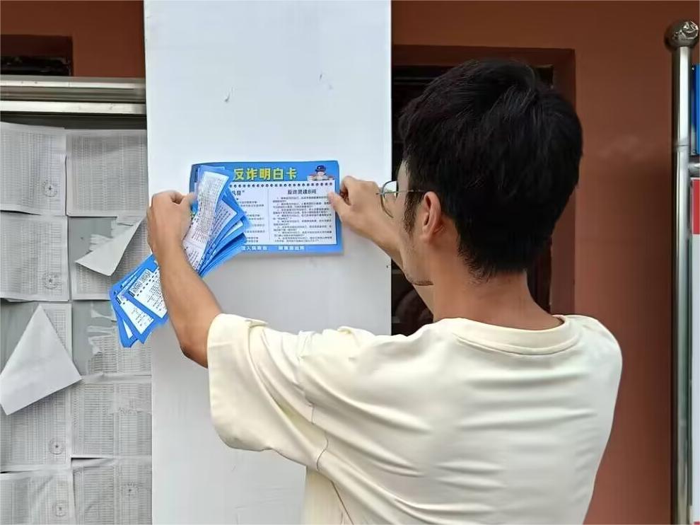 圖為志愿者張貼反詐宣傳單。多彩大學(xué)生網(wǎng) 劉浩成 供圖