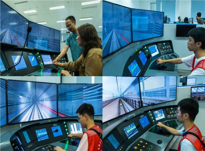 軌道交通模擬駕駛實驗室中的軌道交通高仿真模擬駕駛器配備了真實地鐵駕駛室所需全部控制選項開關,在劉繼成的指導下,實踐團隊成員依次體驗模擬駕駛,學習處理突發情況。