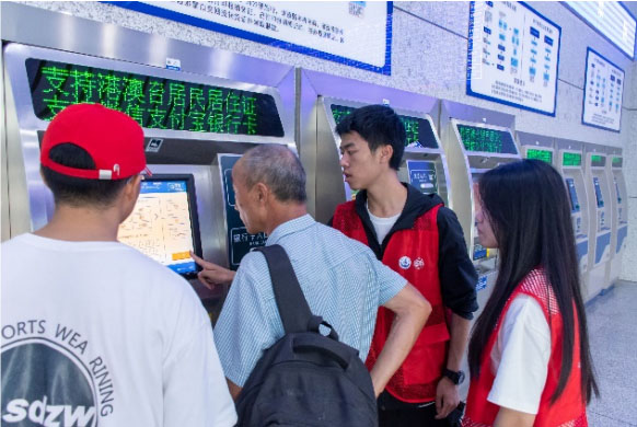 在自動售票處的大學生們耐心解答旅客關于車次、時間、購票等方面的疑問,為每一位前來購票的乘客提供指導,幫助不熟悉售票機的乘客快速完成購票流程指引旅客前往正確的候車區域。