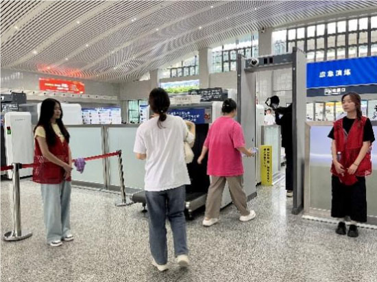 在安檢口的大學生們協助車站工作人員維護進站秩序,耐心引導乘客有序排隊,幫助乘客們提行李,確保旅客的出行安全與順暢,他們還特別關注老年人、孕婦、兒童等特殊旅客的需求,解答乘客關于安檢規定的疑問亦或是站點疑問,為他們提供必要的幫助和照顧。