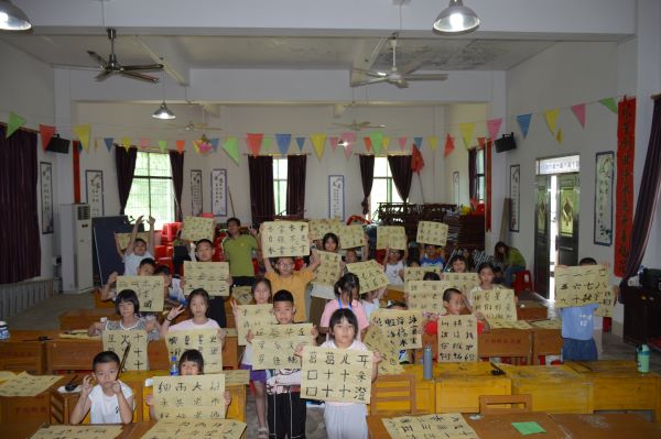 課程伊始,授課老師利用兩幅著名書(shū)法作品《蘭亭集序》和《沁園春·雪》吸引學(xué)生對(duì)課堂的興趣,繼而講述了墨條的作用與“墨煙張”的重要地位、文化價(jià)值,加強(qiáng)了華祝學(xué)生對(duì)家鄉(xiāng)梅州的認(rèn)同感與自豪感。緊接著,授課老師講授了握筆姿勢(shì)、運(yùn)筆方法等基本書(shū)法技巧,助教老師也在一旁加以指導(dǎo)。在老師們的教學(xué)與鼓勵(lì)下,學(xué)生們興趣盎然、全神貫注一撇一捺寫(xiě)出心中所想。提筆首筆之間,孩子們展出笑顏,為自己的書(shū)法成果所愉悅、為中華優(yōu)秀傳統(tǒng)文化所感到自豪。最后,學(xué)生們共同舉起手中的作品,與老師一起合影留念。這次墨條書(shū)法課程,不僅讓華祝學(xué)生深刻理解墨條制作技藝作為非物質(zhì)文化遺產(chǎn)的價(jià)值與意義、在動(dòng)手實(shí)踐中加深對(duì)書(shū)法技藝和墨條制作技藝的理解與掌握,而且?guī)?dòng)學(xué)生們?cè)谥鸩搅私饧亦l(xiāng)墨條技藝文化的過(guò)程中激發(fā)對(duì)于傳統(tǒng)文化的興趣與熱愛(ài),培養(yǎng)起尊重、保護(hù)和傳承中華優(yōu)秀傳統(tǒng)文化的意識(shí)。