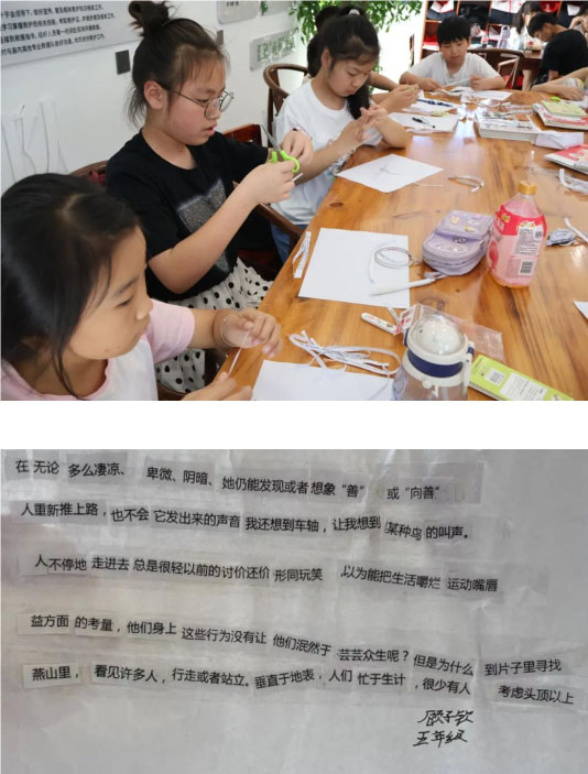 錯位、重構,把詞句拼成詩篇,讓素未謀面的字句碰撞產生意想不到的效果。用一把剪刀、一些文字素材創作出全新的詩句,這就是一種特殊的詩歌創作方式——拼貼詩。下午,六七年級的同學利用剪下的文字素材進行了一場“沉浸式”拼貼詩活動。文字組合產生奇妙碰撞擺脫了條條框框,打破了拘束,同學們發揮了自己的奇思妙想,大膽組合,解構文字,貼出令人眼前一亮的文字。