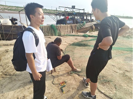圖為實(shí)踐隊(duì)員在漁船邊與紅光新村漁民交流。中國(guó)青年網(wǎng)通訊員 姜新樂(lè) 供圖