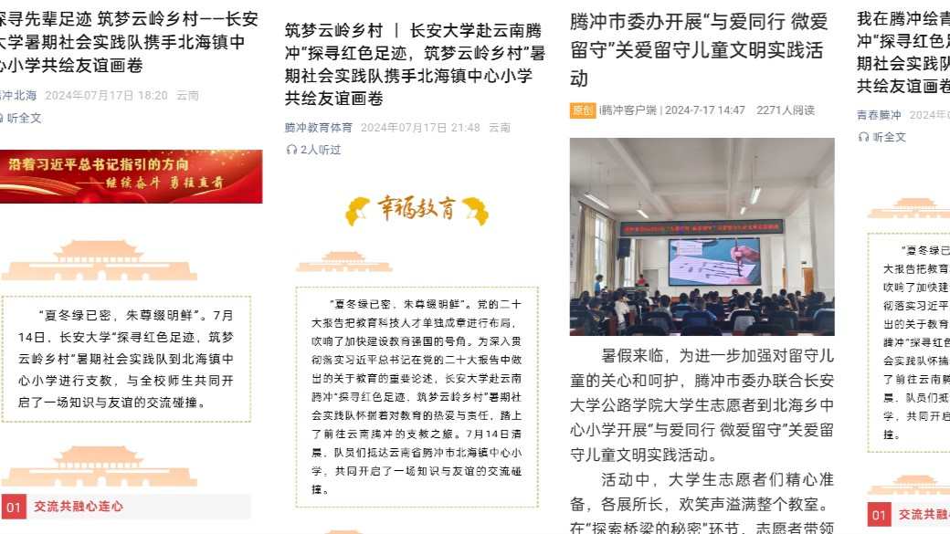 近日,長安大學公路學院的兩支暑期社會實踐隊伍在云南省騰沖市成功開展了以“探尋紅色足跡·筑夢云嶺鄉村”與“觀滇西鄉村振興·筑民族復興之夢”為主題的實踐活動,得到了騰沖市委辦、教體局、團市委等多家單位的熱烈關注和高度評價。