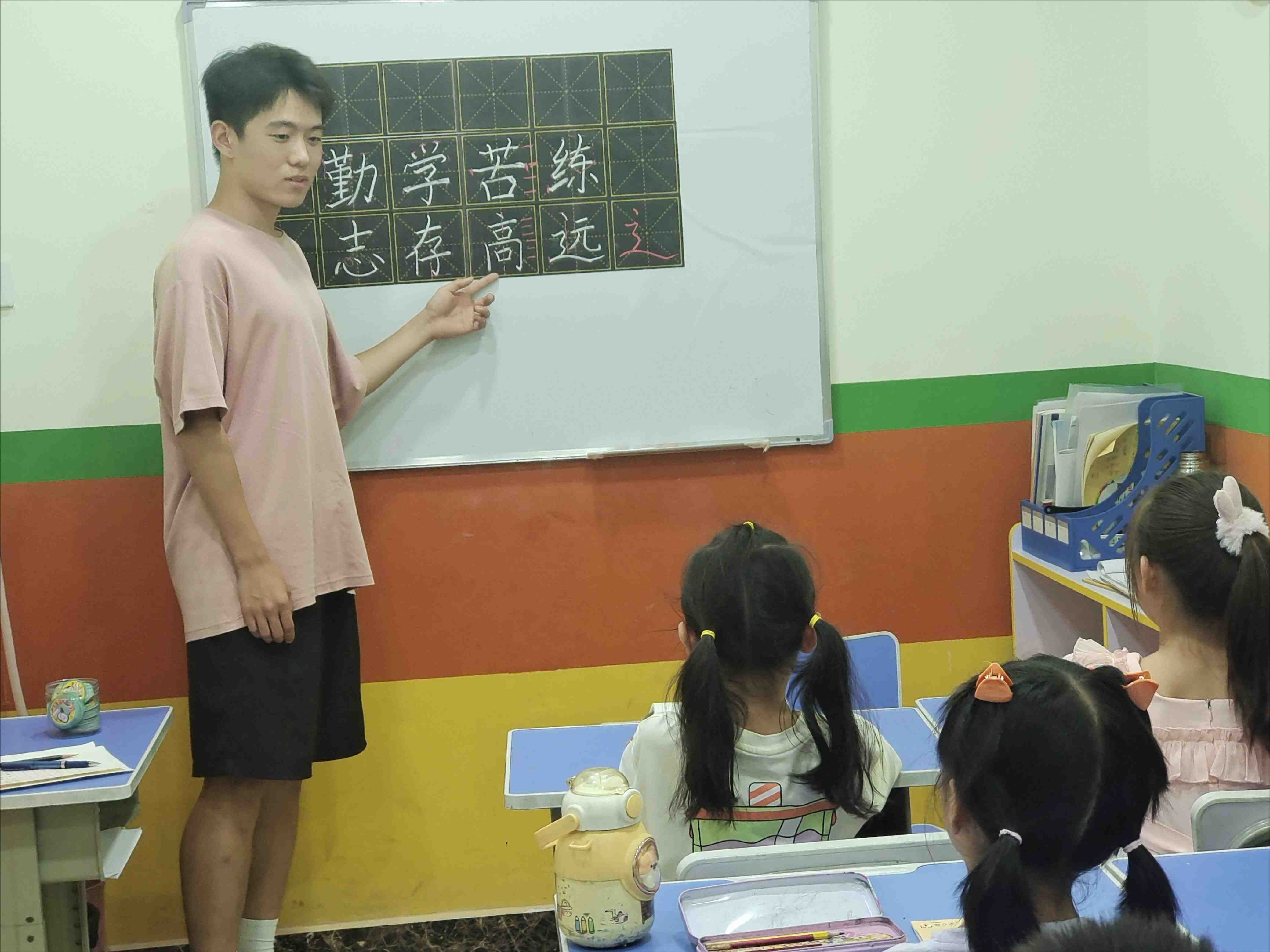 為了和孩子們樹立感情,跟老師交流之后,實(shí)踐隊(duì)員先帶著孩子們進(jìn)行書法練習(xí),耐心的教會孩子們寫好漢字,“勤學(xué)苦練,志存高遠(yuǎn)”不只只是一句口號,也是我們對留守孩子們的一絲期待。