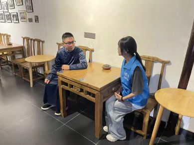 圖為劉姝怡(右)采訪非遺傳承人戴杰(左)。多彩大學生網通訊員吳昊攝