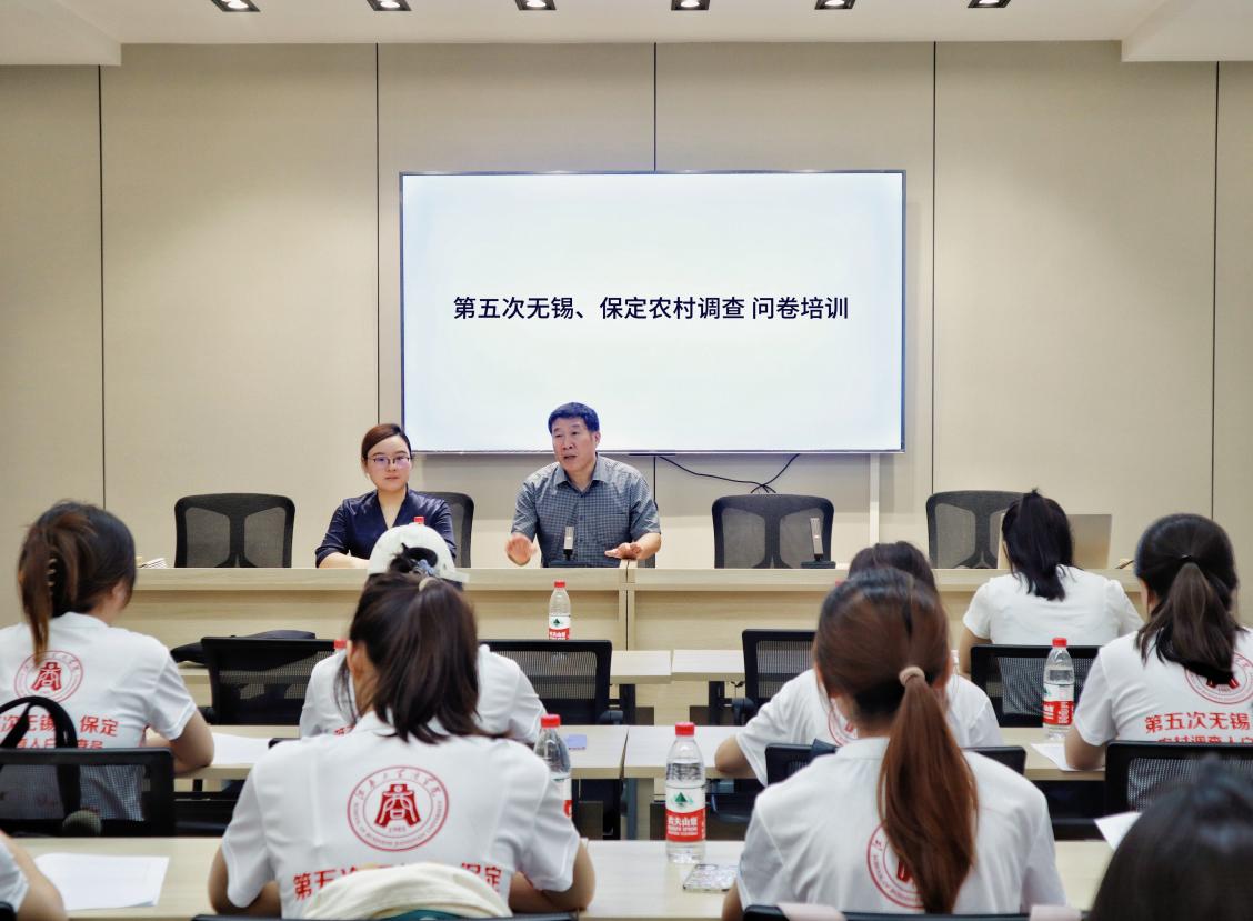 7月8日上午,實踐團抵達無錫市惠山區玉祁街道玉東村村委會,首先開展“第五次無錫、保定農村調查”培訓會。會上,中國社會科學院經濟研究所隋福民教授作調查重點提示,江南大學商學院分團委書記王璁作安全警示教育。項目組通過實例分析與模擬調查等形式,幫助調查員理解調查問卷設計和調查對象所處社會結構。