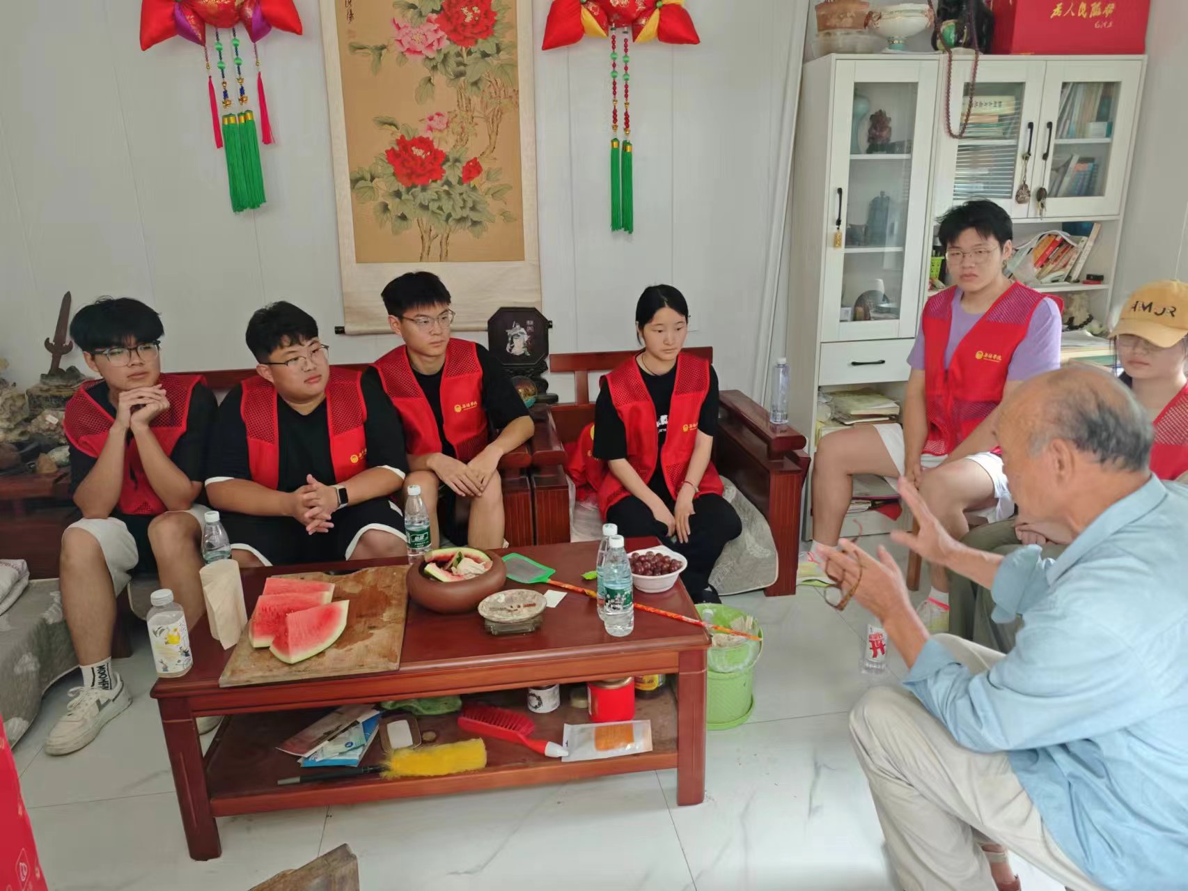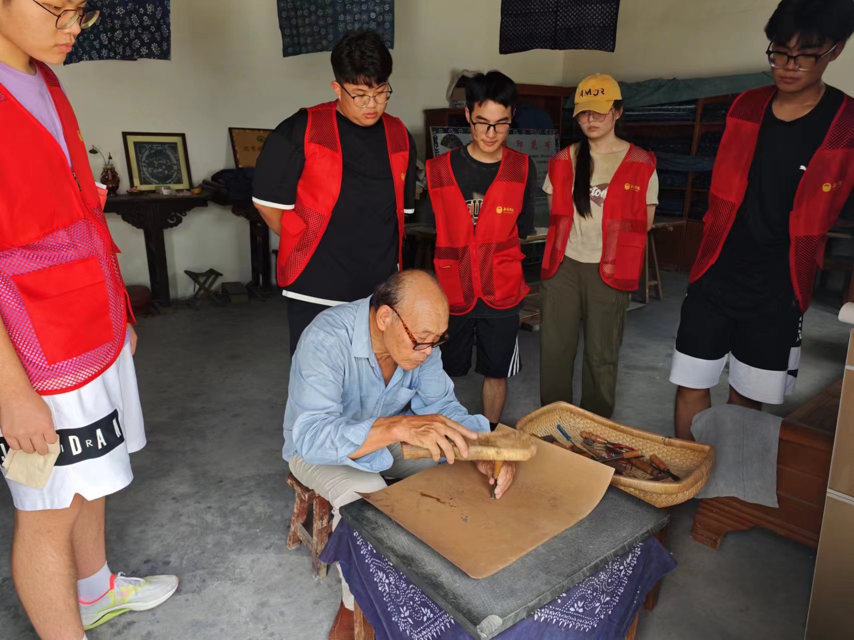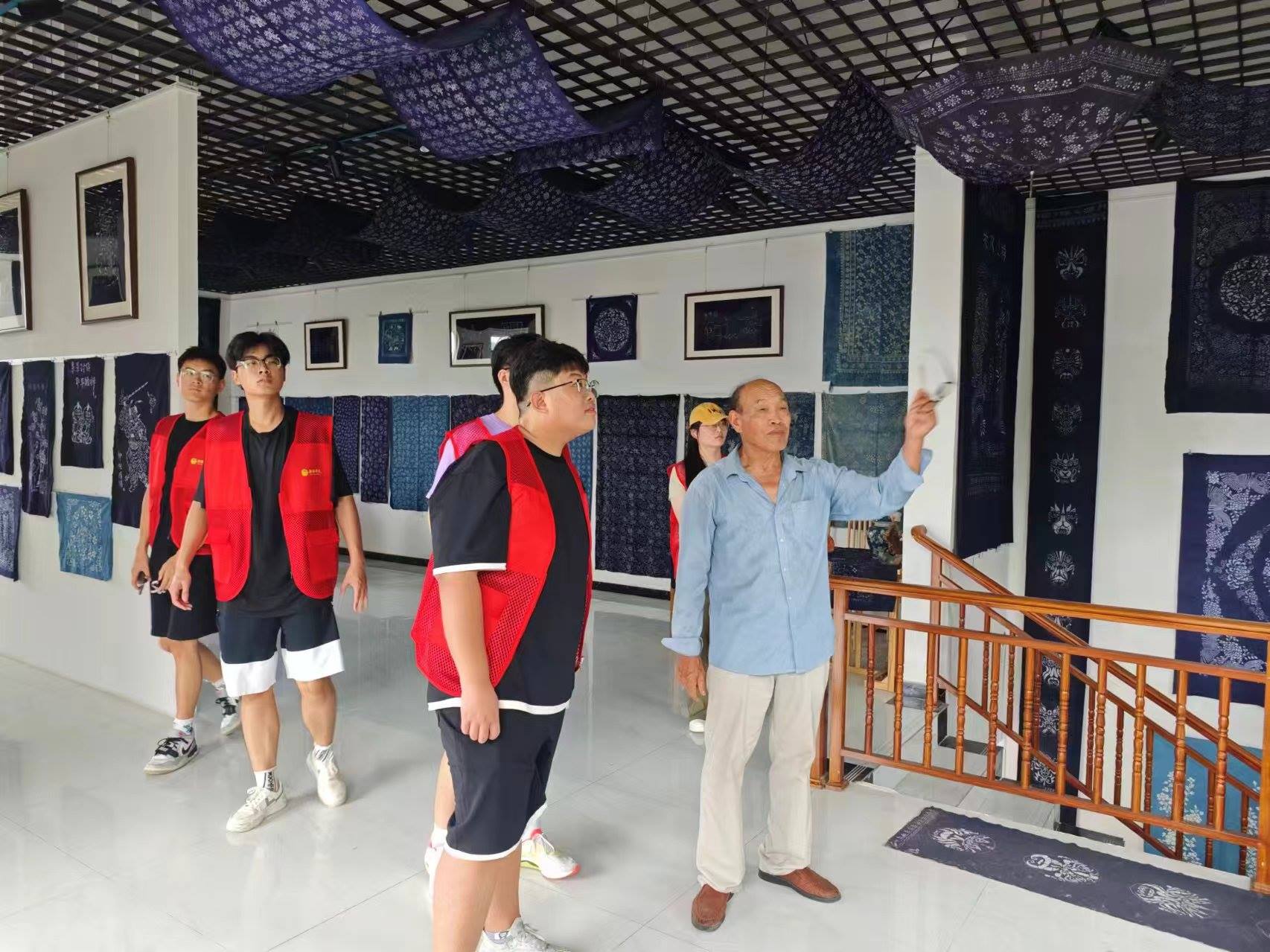 團隊成員首先拜訪了傳承人王如坤先生的家。在這里,團隊成員見到了這位74歲的省級藍印花布傳承人,他熱情地接待了大家。王如坤先生將自己的一生奉獻給了這項古老藝術,為了藍印花布的傳承與發展,他傾盡家資建立了印染坊和藍印花布藝術館。在傳承人家中,團隊成員受到了熱情款待,王如坤先生耐心地回答了小隊成員的問題,并詳細講解了在傳承非遺文化過程中所面臨的困境與挑戰。此外,他還毫無保留地分享了自己在非遺文化傳承方面的心得與體會。