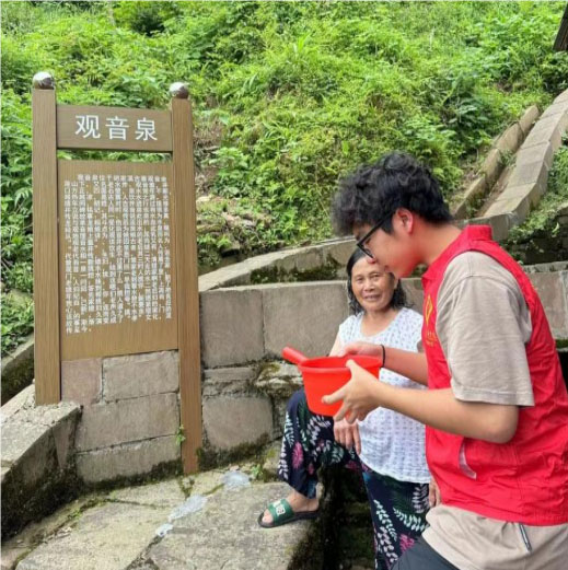 除了經(jīng)濟上的提升,胡家溪村在生活方式和文化傳承方面也取得了顯著成效。實踐團成員們參觀了觀音泉等著名景點,感受到了當(dāng)?shù)鬲毺氐奈幕滋N和自然景觀。在村民的邀請下,大家還參與了為老人打水的善舉,深刻體會到了“贈人玫瑰,手有余香”的真諦。