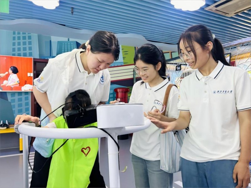 圖為實踐隊成員帶領(lǐng)社區(qū)小朋友體驗道路VR模擬設(shè)備。黃翔宇 攝