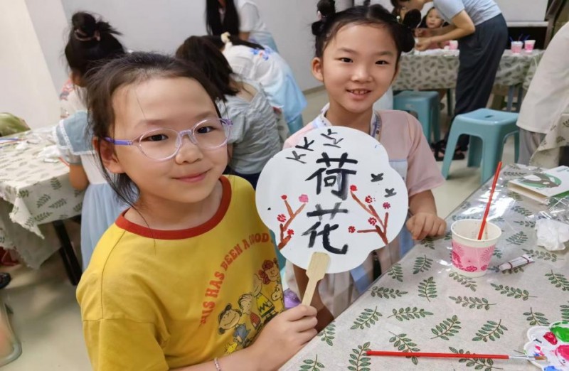 圖為小女孩對完成的團扇作品進行合影留念。劉宣宣 攝