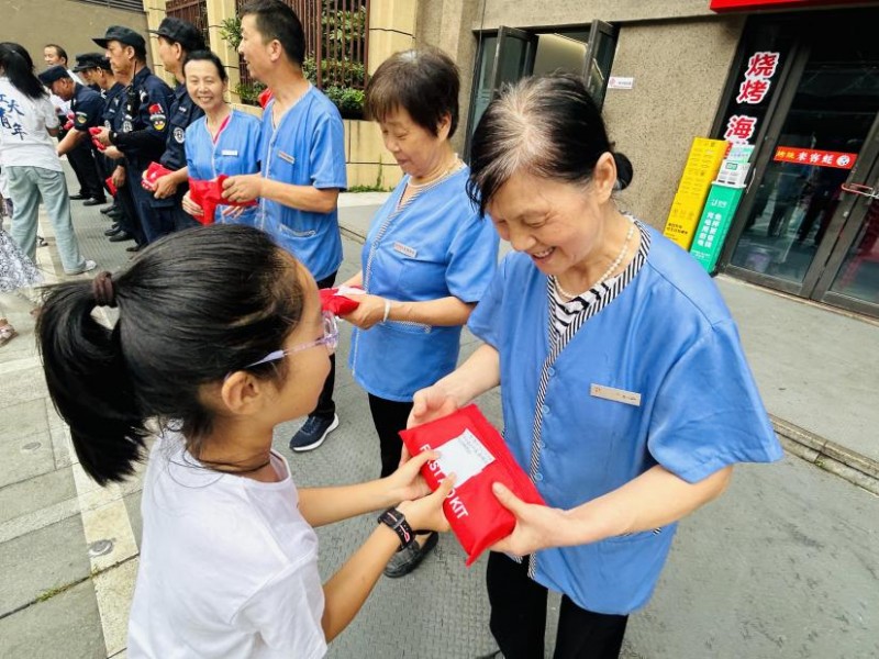 圖為社區(qū)小朋友將制作完成的清涼包和感謝便簽贈送給社區(qū)工作人員。王淑珍 攝