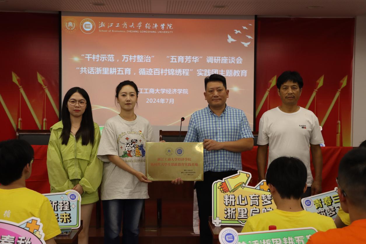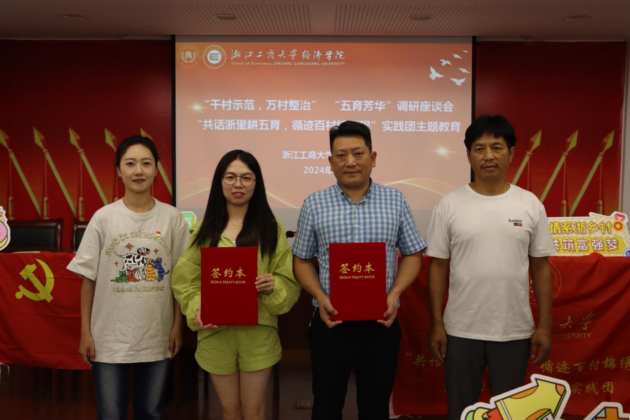 訪談之后,浙江工商大學經濟學院與上山村開展了簽約授牌儀式。汪洋帆老師為上山村培育新時代大學生思政實踐教育基地和勞動實踐教育基地授牌,上山村方光鋒書記代表上山村接牌。隨后,莫瀟杭老師與方光鋒書記共同簽署了共建大學生社會實踐基地協議書,進一步深化了雙方在社會實踐和人才培養方面的合作,為未來的長期合作奠定了堅實基礎。