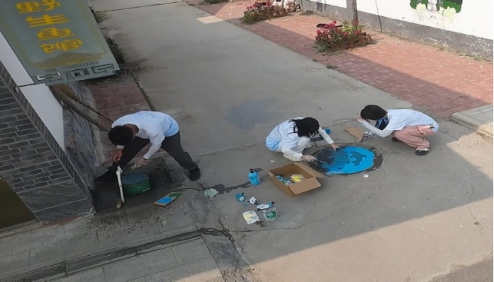圖為無人機高空作業(yè)實踐隊成員井蓋彩繪過程 曹裕卓、季穆源攝