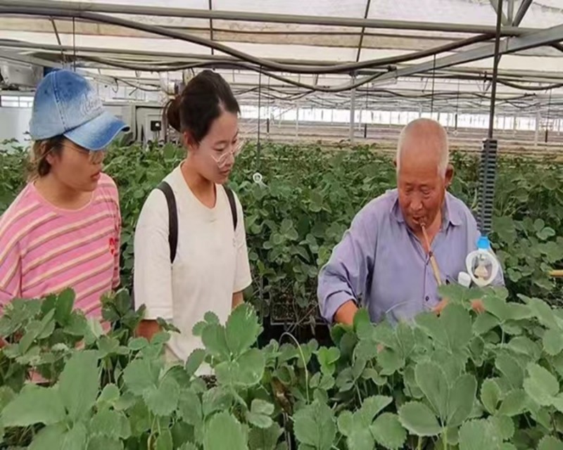 上圖為實踐小分隊進入草莓基地,跟當地老伯學習去除分支的方法。七月主要是當地幼苗生長階段,需要把幼苗分支摘去,再把分支種植在富足土壤里。