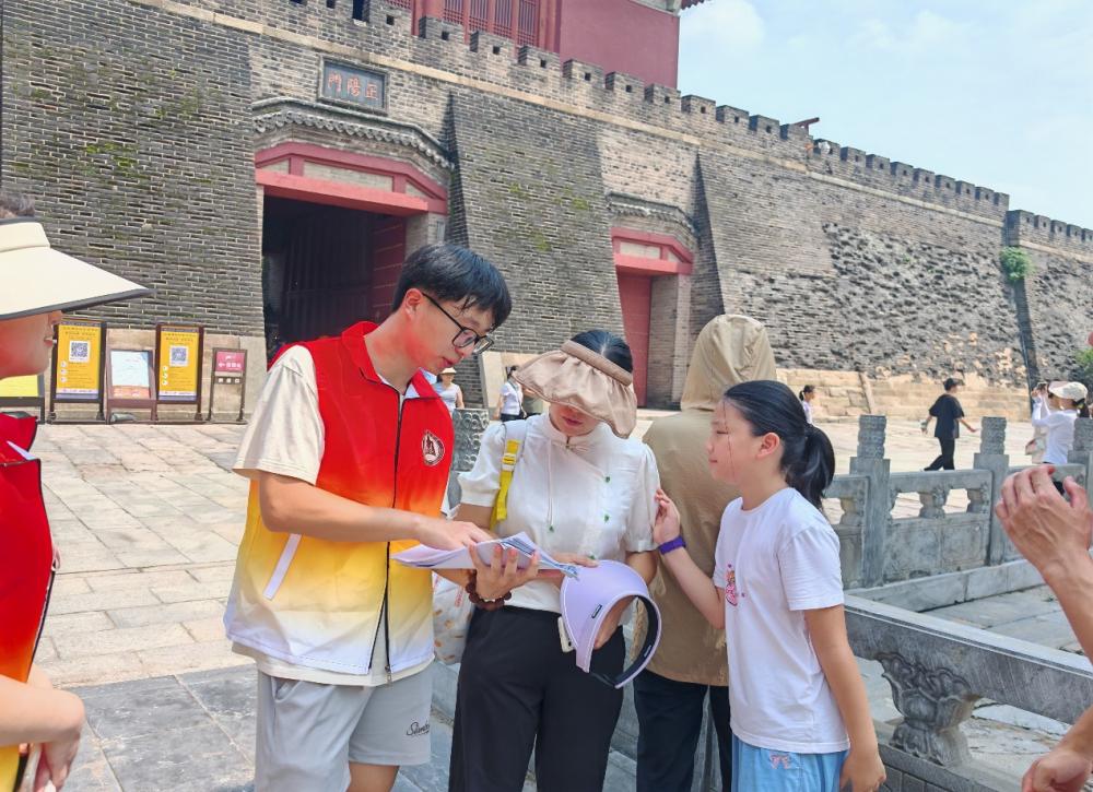 在岱廟的入口處,第一小組的成員們熱情地向剛剛進入景區的游客介紹本次活動的目的和意義,并邀請他們參與問卷調查。游客們紛紛表示出濃厚的興趣,積極配合填寫問卷。其中,來自北京的張先生一家表示:“岱廟是我們這次泰山之旅的重要一站,能夠參與這樣的調查活動,讓我們更加深入地了解岱廟的文化價值,也希望能夠為岱廟的保護和發展出一份力。”