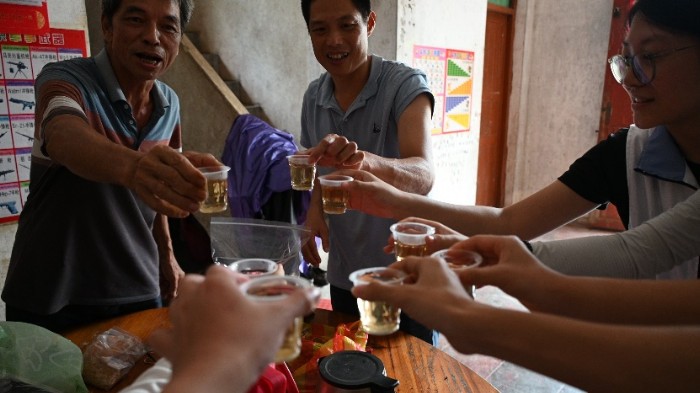 圖為泥水共治實踐團成員和手藝人共賞柚子茶。顏心遠 供圖