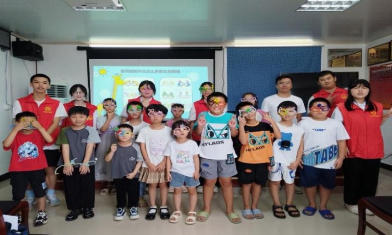 支教成員與埔尾村小朋友們制作“彩色眼鏡”合影