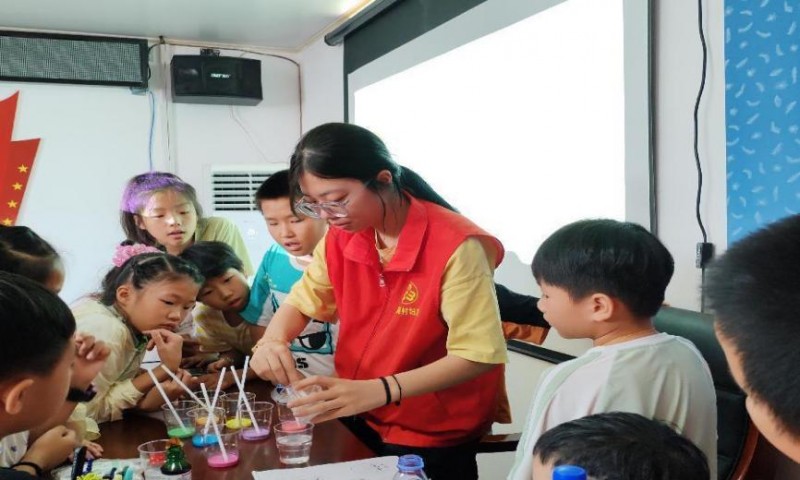 支教團隊還在課程之中穿插了有趣的化學小實驗,“誰偷走了我的紅酒”、“彩色龍卷風”、“牛奶煙花”、“黑頭消失數”、“水母燈”等色彩絢麗的小實驗緊緊抓住了小朋友們的視線。支教隊員們同時引領小朋友們自己動手操作,讓小朋友們親眼見證化學反應的奇妙變化,不僅增長了科學知識,更激發了他們對科學世界的好奇與探索欲。