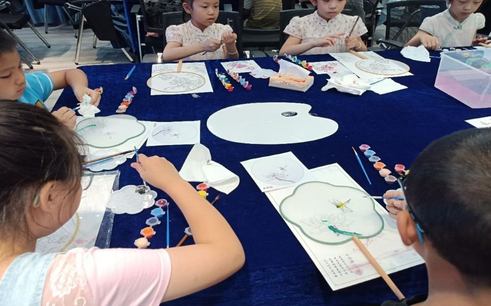 圖為書畫家教小朋友們如何進行團扇的繪制。楊恩熙 供圖