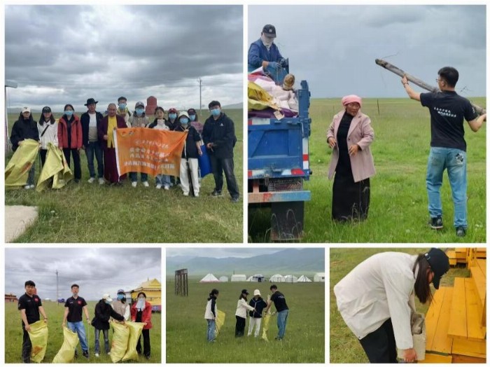 除了支教,實踐團還積極投身于幫助牧民修繕、保護草場環境的工作中。并與牧民們結下了深厚的情誼,也更加深刻地體會到了他們的辛勤付出和對這片土地的熱愛。大家齊心協力,手持工具,彎下腰,仔細地拾起每一片垃圾,每個人的臉上都洋溢著滿足的笑容。在廣闊草場上,彎腰的身影成為最美風景,手中的垃圾袋裝滿了對這片土地最真摯的熱愛。