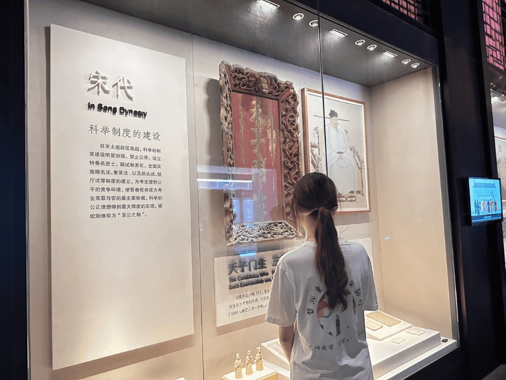 在“考試形式”展廳,團隊成員被科舉制度嚴格規范的考試形式所震撼。從童試到鄉試、會試再到殿試,每一輪考試都有著明確的規則和標準?紙霾贾脟栏、監考制度嚴苛、試卷密封閱卷等防作弊措施更是確保了考試的公正性。這種嚴謹有序的考試形式不僅為國家選拔了大量優秀人才,也為后世的考試制度提供了寶貴的經驗和借鑒。