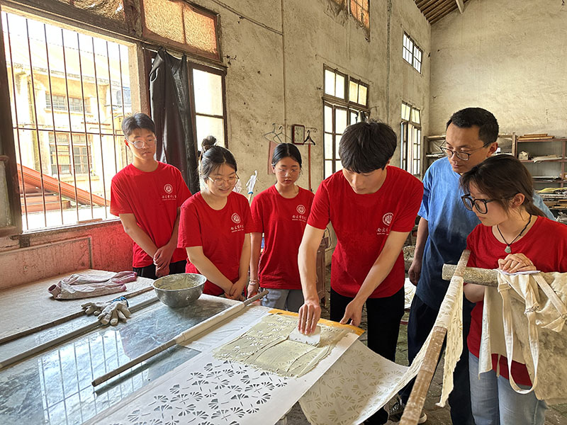 為了進(jìn)一步探索藍(lán)印花布印染技藝這一國家級(jí)非物質(zhì)文化遺產(chǎn)技藝,團(tuán)隊(duì)成員走進(jìn)藍(lán)印花布手工作坊,將理論知識(shí)付諸實(shí)踐。在工坊師傅的悉心指導(dǎo)下,團(tuán)隊(duì)成員親手參與了藍(lán)印花布的制作過程,從設(shè)計(jì)圖案、刻制花版到刮漿印染、晾曬成品,每一步都凝聚著他們的汗水與智慧。繁瑣的工序后,當(dāng)花布展開的那一刻,在欣賞點(diǎn)、線、面的融合交錯(cuò)中,團(tuán)隊(duì)成員體味藍(lán)印花布所特有的韻律美感,也對(duì)非遺技藝的傳承有了更深刻的認(rèn)識(shí)。