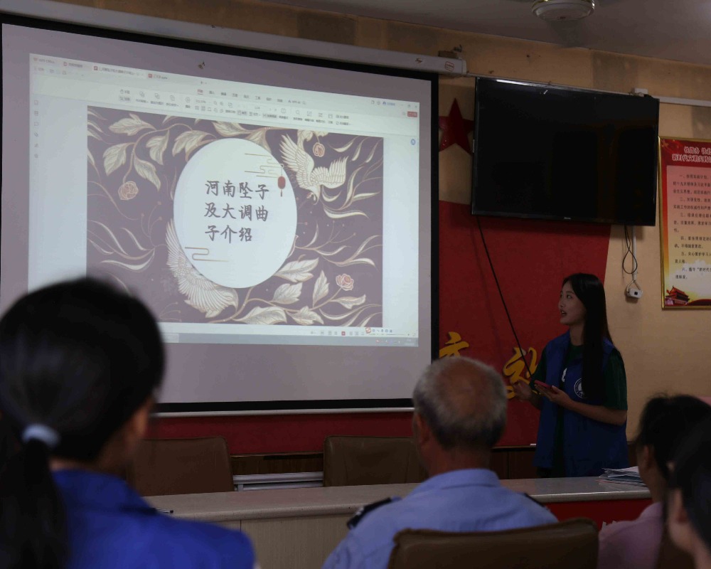 經歷兩天的學習,隊員們帶著滿滿的收獲,來到了寶豐縣鐵北社區進行宣講。隊員們與居委會溝通,將居民們集中在會議室,通過ppt詳細介紹河南墜子合大調曲子,同時播放錄制的傳承人表演視頻。作為寶豐當地居民,隊員們從后續采訪中了解到大家都對曲藝均有所了解,但是大部分居民并未加入到其學習和演唱中,只有部分居民學習了曲藝演唱并將其帶給了自己的家人朋友。針對此情況,隊員們也向居民介紹了傳承所現在的免費教學活動,并鼓勵更多居民借助當地政策加入到曲藝的傳承中。