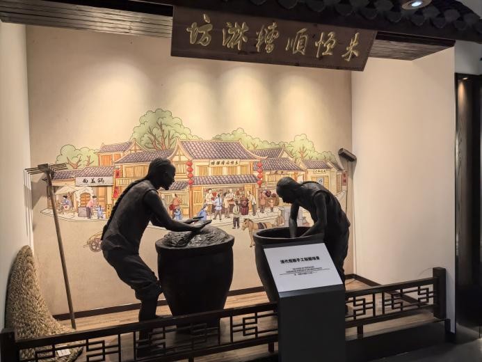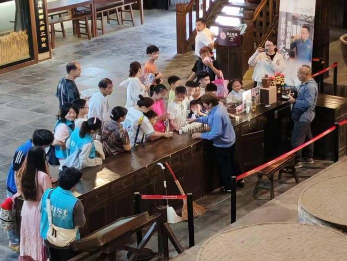 傳統工藝傳承創新,醋香經典與風華共鳴。下一站是醋藝館,它是對鎮江醋制作工藝的詳細展示。這個展區重點介紹了傳統的釀醋技藝,包括從選材、發酵到成品的全過程。展館內展出了各種制作醋所需的傳統工具和設備,隊員通過詳細的圖解和實物體驗到釀醋的每一個步驟。