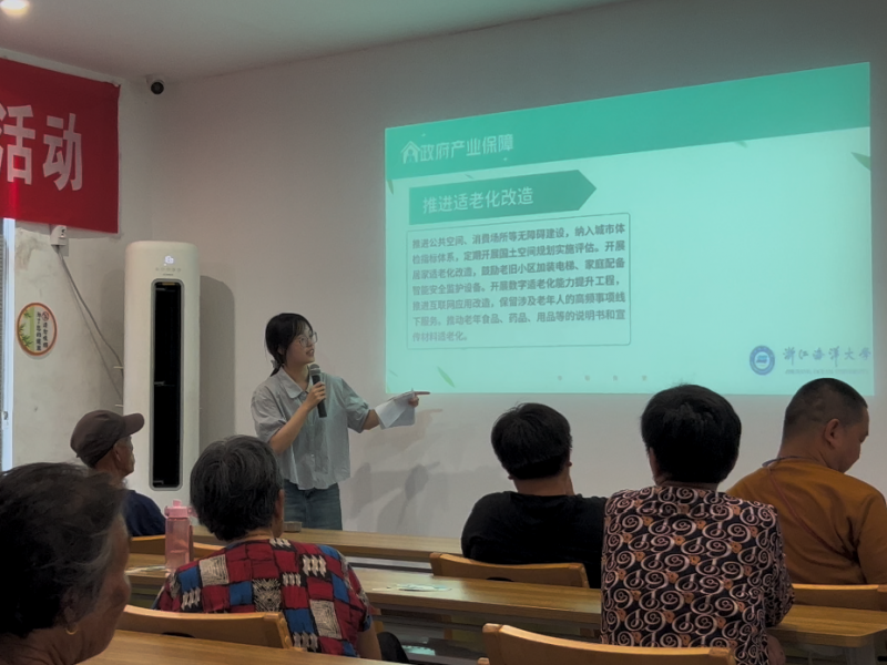 前期的實地調研使團隊成員對幸福食堂的建設實效、老人的境況與需求形成更深的認識,也萌生了讓相關政策惠及更多老人的想法。因此,7月28日中午,調研團來到雙橋街道老年活動中心進行宣講活動,在社區幫助下向老人介紹政府的養老政策和“幸福食堂”政策。團隊成員選擇用舟山方言宣講,力求讓老人們清楚地了解相關內容。現場座無虛席,反響熱烈,落座的老年人紛紛點頭,給予對政策的肯定和支持,這場宣講也得到了社區工作人員的認可。在宣講結束后,調研團也主動走到老人身邊,為老人們答疑解惑,不少老人都認為經過這次宣講,對政府如今的養老優惠政策有了一定的了解。