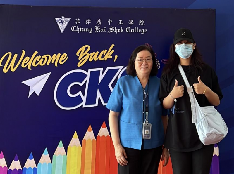 (實踐團成員與菲律賓中正學院高中部中文部主任朱惠玲老師的合影)