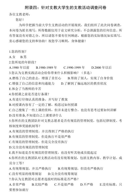 2. 完善監督管理機制對支教大學生工作、不僅嚴格管理,更應該關心他們的生活,使得他們盡快適應鄉村。通過工作上的合理監管,生活上的合理安排,讓支教大學生提升自我價值感,努力工作。