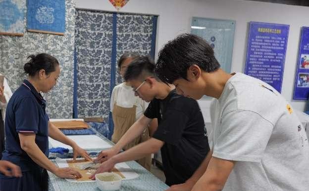“紙上得來終覺淺絕知此事要躬行”。為了更深入地了解藍印花布,團隊成員親自體驗了藍印花布的制作過程。在老師的指導下,成員動手操作,感受到了傳統工藝的獨特魅力。通過親身體驗,我們更加明白了傳承非遺文化的重要性,也讓我們對藍印花布產生了濃厚的興趣。