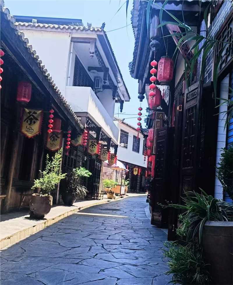 這是實踐隊前往的第一個地點——煥古鎮,瀕臨漢江,又名“宦姑灘”,有“宦姑”故事得名。此鎮以茶聞名,自唐代開始為朝廷貢茶,是紫陽茶中極品。老街古巷,板壁青瓦,青石鋪地,景致古樸,山川秀美。這是實踐隊對此地的第一印象。深入了解后,隊員們了解到此處以硒茶小鎮為主要項目,依托茶葉全產業布鏈局環環相扣,融合了茶、歌、道及歷史的元素,展示了獨特的漢江風情和硒健康養生養護的特點。