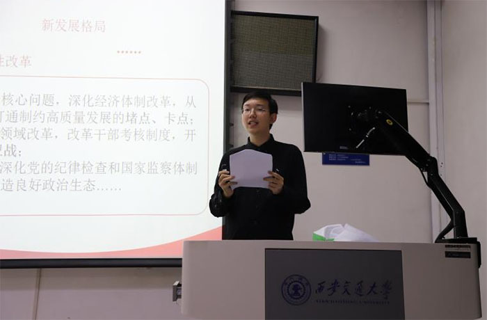 會議邀請了西安交通大學學生微宣講團成員吳子傲,開展了“磅礴偉力激蕩征程向前——解讀進一步全面深化改革”中國共產黨二十屆三中全會精神宣講。他以飽滿的熱情和嚴謹的態度,深入闡釋了中國共產黨第二十屆中央委員會第三次全體會議的精神實質,全面解讀了深化改革的政策導向,激發了大家的愛國熱情和奮斗精神。