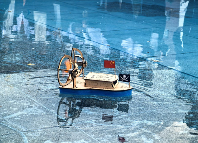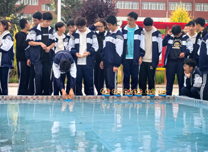 圖為學生拼接好的船模在水池中游行。張京 供圖